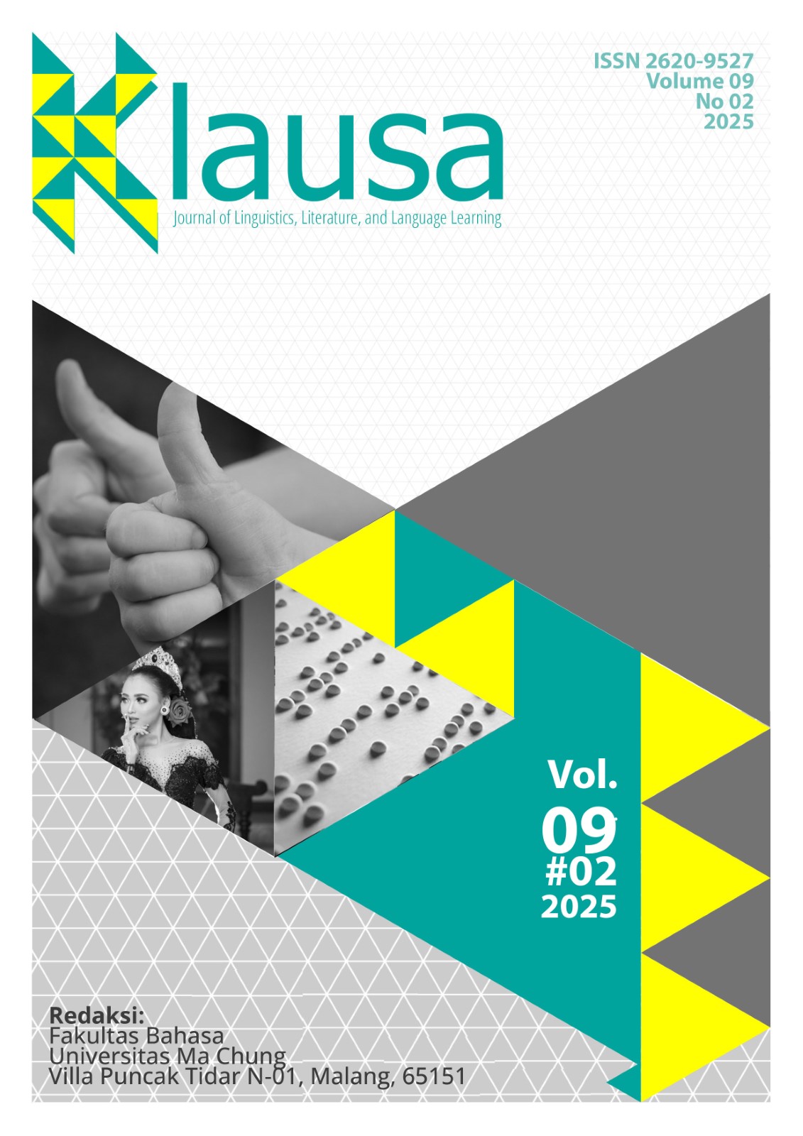 It is our great pleasure to present KLAUSA Journal Volume 9 No. 2 (2025), an issue that reflects the journal’s continued commitment to advancing scholarly inquiry in linguistics, literature, and discourse studies across diverse cultural and media contexts. The articles gathered in this volume demonstrate both theoretical rigor and methodological diversity, addressing contemporary issues ranging from semiotics, pragmatics, and semantics to media studies, digital discourse, and literary analysis.